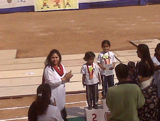 Today I attended my daughter’s school sports day. This was one of the most beautiful moments, to see my 4 years old cute princess standing on the tracks and competing with her classmates. They had to run a while then pick up a football and then hop from there to the ending line and sit on a chair. Hiya (My daughter) ran to pick up the football. I was shouting, clapping and was completely out of my world. Then she was the first to pickup the ball and then she started hopping. She reached the ending line first. Then she looked back to see where are others. In the mean time one of her friends reached the end line and sat on the chair. Then Hiya realized/remembered that she has to sit on chair. So she sat and she won the second prize. I was so happy and excited to see her win a medal.